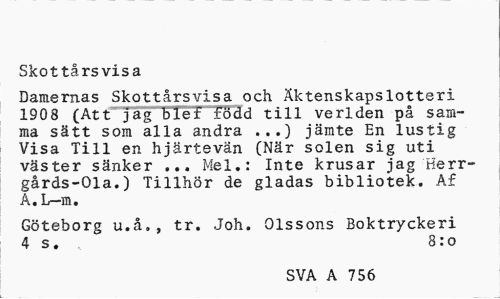 //// Skottrsvisa //// Damernas Skottrsvisa och ktenskapslotteri 1908 (Att jag b1et-ldd till verlden p samma stt som alla andra ...) jmte En lustig Visa Till en hjrtevn (Nr solen sig uti vster snker ... Mel.: Inte krusar jag Herrgrds-Ola.) Tillhr de gladas bibliotek. Af //// Gteborg u.., tr. Joh. Olssons Boktryckeri //// 4 s. 8:o //// SVA A 756 ////