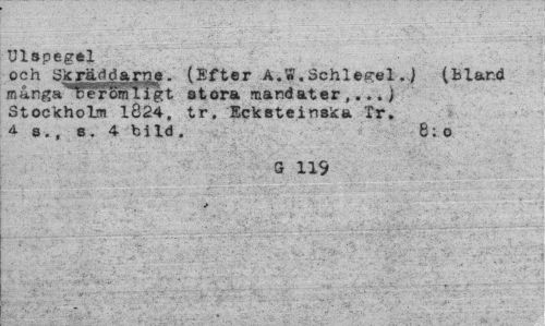//// Ulspegel //// och Skrdda ne. (Efter A.W.Schlegel..) (bland //// ,rlat //// mnga IgeroM igt stora mandater,...) Stockholm 1824. tr. Ecketeinska Tr. 4 a., e. 4 bild. 8:o //// G 119 ////