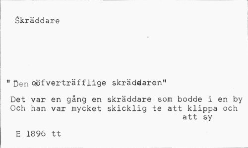 //// Skrddare //// iden Qfvertrfflige skrddaren" //// Det var en gng en skrddare som bodde i en by Och han var mycket skicklig te att klippa och //// att sy //// E 1896 tt ////