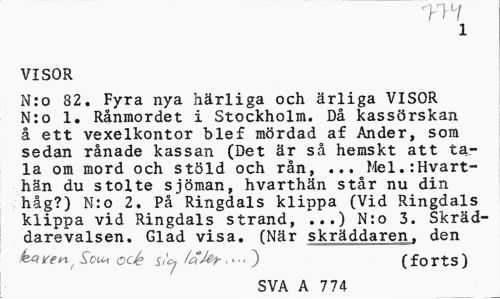 //// VISOR //// N:o 82. Fyra nya hrliga och rliga VISOR N:o 1. Rnmordet i Stockholm. D kassrskan ett vexelkontor blef mrdad af Ander, som //// sedan rnade kassan (Det r s hemskt att tala om mord och stld och rn, ... Mel.:Hvarthn du stolte sjman, hvarthn str nu din hg?) N:o 2. P Ringdals klippa (Vid Ringdals klippa vid Ringdals strand, N:o 3. Skrd- //// darevalsen. Glad visa. (Nr skrddaren, den //// kRre gOU4 OCk/a,1e4, . ) //// ,7 (forts) //// SVA A 774 ////