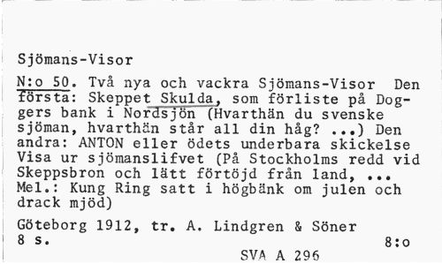//// Sjmans-Visor //// N:o 50. Tv nya och vackra Sjmans-Visor Den TUM: Skeppet Skulda, som frliste p Dog-gers bank i Nordsjn (Hvarthn du svenske sjman, hvarthdn str all din hg? ...) Den andra: ANTON eller dets underbara skickelse Visa ur sjmanslifvet (P Stockholms redd vid Skeppsbron och ltt frtjd frn land, ... Mel.: Kung Ring satt i hgbnk om julen och drack mjd) //// Gteborg 1912, tr. A. Lindgren & Sner //// 1 8 s. 8:0 //// SVA A 296 ////