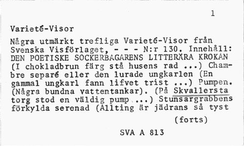 //// 1 //// Varietg-Visor //// Ngra utmrkt trefliga Varietd-Visor frn Svenska Visfrlaget, - - N:r 130. Innehll: //// DEN POETISKE SOCKERBAGARENS LITTERRA KROKAN (I chokladbrun frg st husens rad ...) Chambre separ6 eller den lurade ungkarlen (En gammal ungkarl fann lifvet trist ...) Pumpen. (Ngra bundna vattentankar). (P Skvallersta torg stod en vldig pump ...) Stunsargrabbens frkylda serenad (Allting r jdrans s tyst //// (forts) //// SVA A 813 ////