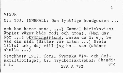 //// 2 //// VISOR //// N:r 103. INNEHLL: Den lycklige bondgossen //// och hon heter Anna, Gammal krleksvis?,: //// pplet vxer bde rdt och grnt, (Men dr bor ...) Skymnin sstund. Ensam du r ej, Se vid din si a itter var afton ...) Greta //// lilla! ack, dej vill jag ha san (sdant skulle ...) //// Stockholm 1912, frl. Svenska Vis- och Sm'.- skriftfrlaget, tr. Tryckeriaktiebol. Skandia //// R g. 8:0 //// SVA A 792 ////