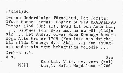 //// Fgneljud //// Twenne Underdniga Fgneljud, Det Frsta: fwer Hennes Kongl. Hghet SOPHIA MAGDALENAS Intog: 1766 (Up: alt, hwad Lif och Anda har, ...) Sjunges som: Hwar man m nu wl gldja sig ... Det Andra. Ufwer Swea Konunga husets Hga tte Grenar 1769 (Kom ltt oss dricka, Wr milda Konungs dyra Skl ...) Kan sjungas: under sin egen behageliga Melodie //// rebro u. . //// 8 s. 8:o //// KB okat. Vitt. sv. vers (tal) 831 kungl. Sofia Magdalena -1766 ////