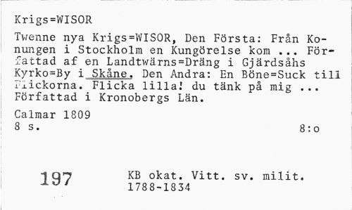 //// Krigs=WISOR //// Twenne nya Krigs=WISOR, Den Frsta: Frn Konungen i Stockholm en Kungrelse kom ... Frfattad af en Landtwrns=Drng i Gjrdshs Kyrko=By i Skne. Den Andra: En Bne=Suck till Fickorna. Flicka lilla! du tnk p mig ... Frfattad i Kronobergs Ln. //// Calmar 1809 //// 8 s. 8:o //// 197 //// KB okat. Vitt. sv. mint. 1788-1834 ////