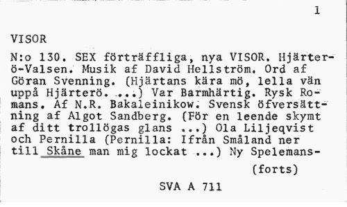 //// 1 //// VISOR //// N:o 130. SEX frtrffliga, nya VISOR. Hjrter -Valsen. Musik af David Hellstrm. Ord af Gran Svenning. (Hjrtans kra m, lella vn upp Hjrter. ...) Var Barmhrtig. Rysk Romans. Af N.R. Bakaleinikow. Svensk fversttning af Algot Sandberg. (Fr en leende skymt af ditt trollgas glans ...) Ola Liljeqvist och Pernilla (Pernilla: Ifrn Smland ner till Skne man mig lockat ...) Ny Spelemans- //// (forts) //// SVA A 711 ////