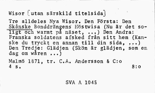 //// Wisor !,utan srskild titelsida] //// Tre alldeles Nya Wisor. Den Frsta: Den Sknske Bonddrngens Hstwisa (Nu r det soligt odi warmt pa nset, ...) Den Andra: Franska soldatens afsked frn sitt hem (Kanske du tryckt en annan till din sida, ...) Den Tredje: Gldjen (Skn r gldjen, som en dag om wren ...) //// Malm 1871, tr. C.A. Andersson & C:o //// 4 s. 8:o //// SVA A 1045 ////
