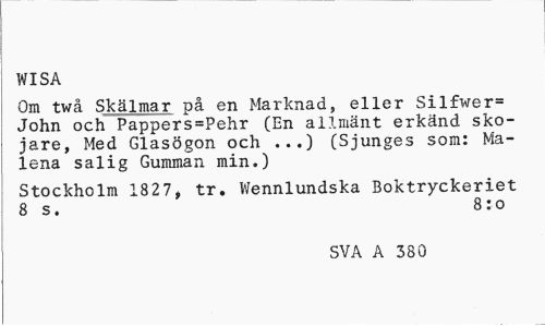 //// WISA //// Om tw Sklmar p en Marknad, eller Silfwer= John och Pappers=Pehr (En allmnt erknd skojare, Med Glasgon och ...) (Sjunges som: Ma-lena salig Gumman min.) //// Stockholm 1827, tr. Wennlundska Boktryckeriet 8 s. 8:o //// SVA A 380 ////