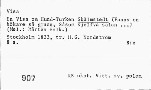 //// Visa //// En Visa om Hund-Turken Sklmstedt (Fanns en hkare s grann, Ssom sjelfva satan ...) (Alel.: Mrten Holk.) //// Stockholm 1833, tr. H.G. Nordstrm //// 8 s. 8:o //// 907 KB okat. Vitt. sv. polera ////