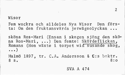 //// 2 //// Wisor //// Fem wackra och alldeles Nya Wisor Den frsta: Om den fruktansvrda jerwgsolyckan //// skna Ros-Mari (Ensam i skogen sjng den skna Ros-Mari, ...) Den femte: Skrdeflickan, Romans (Hon vxte i torpet wid susande skog, //// .) //// Malm 1897, tr. C.A. Andersson & C:s boktr. 8 s. 8:o //// SVA A 474 ////
