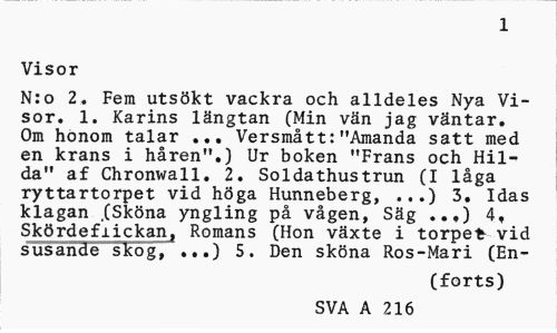 //// 1 //// Visor //// N:o 2. Fem utskt vackra och alldeles Nya Visor. 1. Karins lngtan (Min vn jag vntar. Om honom talar Versmtt:"Amanda satt med //// en krans i hren".) Ur boken "Frans och Hilda" af Chronwall. 2. Soldathustrun (I lga ryttartorpet vid hga Hunneberg, ...) 3. Idas klagan fSkna yngling p vgen, Sg ...) 4, Skrdeflickall Romans (Hon vxte i torpet vid susaille iiog, ...) 5. Den skna Ros-Mari (En- //// (forts) //// SVA A 216 ////