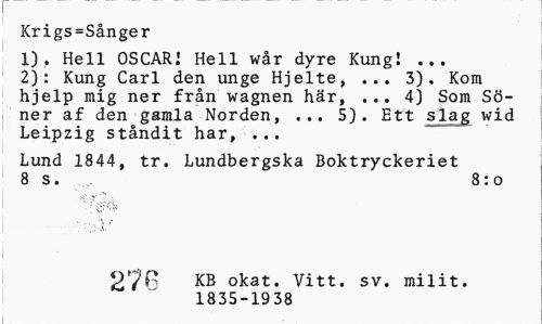 //// Krigs=Snger //// 1). Hell OSCAR! Hell wr dyre Kung! ... //// 2): Kung Carl den unge Hjelte, 3). Kom //// hjelp mig ner frn wagnen hr, ... 4) Som S- //// ner af den gamla Norden, 5). Ett slas wid //// Leipzig stndit har, ... //// Lund 1844, tr. Lundbergska Boktryckeriet //// 8 s. 8:o //// 27r, KB okat. Vitt. sv. milit. //// 1835-1938 //// r ////