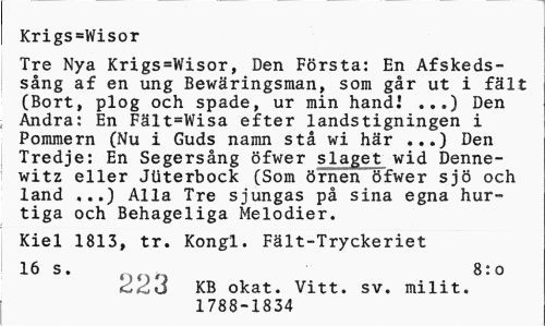 //// Krigs=Wisor //// Tre Nya Krigs=Wisor, Den Frsta: En Afskedssng af en ung Bewringsman, som gr ut i flt (Bort, plog och spade, ur min hand! ...) Den Andra: En Flt=Wisa efter landstigningen i Pommern (Nu i Guds namn st wi hr ...) Den Tredje: En Segersng fwer sla&et wid Dennewitz eller JUterbock (Som rnen fwer sj och land ...) Alla Tre sjungas p sina egna hurtiga och Behageliga Melodier. //// Kiel 1813, tr. Kongi. Flt-Tryckeriet //// 16 s. 8:o //// 223 KB okat. Vitt. sv. milit. 1788-1834 ////
