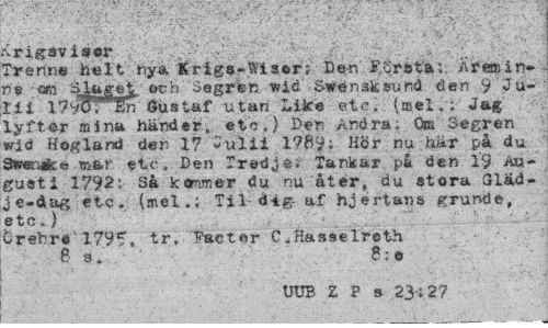 //// Treritie helt nya l rige-V isers Den Fi.-;r5ta,, //// re era a e4 och .segren widwenskz,,,und den 9 J u //// n i Ity Gustaf utan Like et,. (mei... Jag //// ly-fter mina hnder, etc.) Den ?..ndra: Om Segren wid ifogland der 17 :;u11.1 1789: Hr nu hr p du ~rwice motar etc. Den Tredje; Tankar p den 19 Augusti 1792: S kommer du nu 'ter, du stora Gld- //// je-dag etc. Til dig; af hjertans g,runde, //// etc.) //// erebre 1795, tr, Paeter C.Hasselreth //// P:e //// UUB Z P s 23 27 ////
