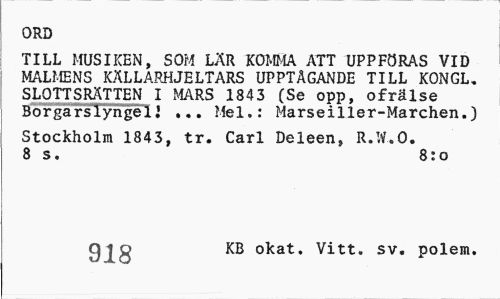 //// ORD //// TILL MUSIKEN, SOM LR KOMMA ATT UPPFRAS VID MALMENS KALLARHJELTARS UPPTAGANDE TILL KONGL. SLOTTSRTTEN I MARS 1843 (Se opp, ofrlse //// BorkMYRITI! Mel.: Marseiller-Marchen.) //// Stockholm 1843, tr. Carl Deleen, R.W.O. //// 8 s. 8:0 //// 918 KB okat. Vitt. sv. polem. ////