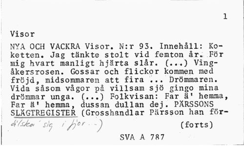//// 1 //// Visor //// NYA OCH VACKRA Visor. N:r 93. Innehåll: Ko-ketten. Jag tänkte stolt vid femton år. För mig hvart manligt hjärta slår. (...) Vingåkersrosen. Gossar och flickor kommen med fröjd, midsommaren att fira ... Drömmaren. Vida såsom vågor på villsam sjö gingo mina drömmar unga. (...) Folkvisan: Far ä' hemma, Far ä1 hemma, dussan dullan dej. PÄRSSONS SLÄGTREGISTER (Grosshandlar Pärsson han för- //// -fV&é* ' stj '/jor (forts) //// SVA A 78 7 ////