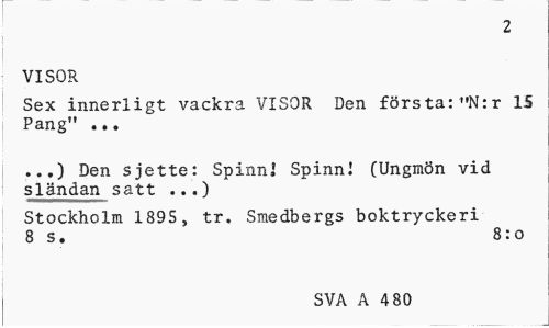 //// 2 //// VISOR //// Sex innerligt vackra VISOR Den första: "N:r IS Pang" ... //// ...) Den sjette: Spinn.' Spinn! (Ungmön vid sländan satt ...) //// Stockholm 1895, tr. Smedbergs boktryckeri 8 s. 8:o //// SVA A 4 80 ////