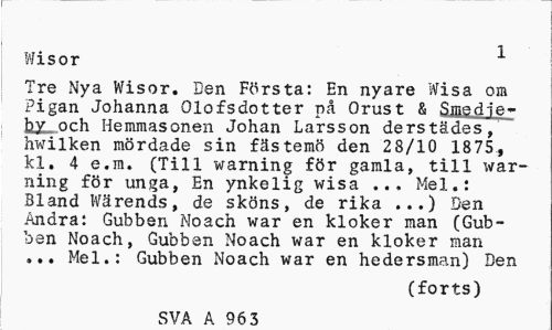 //// Wisor 1 //// Tre Nya Wisor. Den Första: En nyare Wisa om Pigan Johanna Olofsdotter på Orust & Smedje-fcX-Och Hemmasonen Johan Larsson derstädes, hwilken mördade sin fästemö den 23/10 1875., kl. 4 e.m. (Till warning för gamla, till war-ning för unga, En ynkelig wisa ... Mel.: Bland Wärends, de sköns, de rika ...) Den Andra: Gubben Noach war en kloker man (Gubben Noach, Gubben Noach war en kloker man ... Mel.: Gubben Noach war en hedersman) Den //// (forts) //// SVA A 96 7, ////