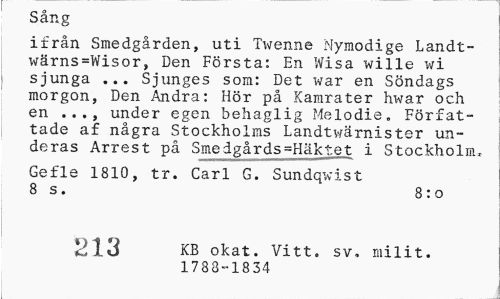 //// Sång //// ifrån Smedgården, uti Twenne Nymodige Landt-wärns=Wisor, Den Första: En Wisa wille wi sjunga ... Sjunges som: Det war en Söndags morgon, Den Andra: Hör på Kamrater hwar och en ..., under egen behaglig Melodie. Författade af några Stockholms Landtwärnister un-deras Arrest på Smedgårds=Häktet i Stockholm, //// Gefle 1810, tr. Carl G. Sundqwist 8 s. 8:0 //// 213 KB okat. Vitt. sv. milit. //// 1788-1834 ////