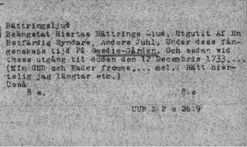 //// - 'V':; ' ¦ v ,. //// v,:;.. '.• . .'. //// Bättringaljud //// Beängatat Hiertas Bättrings -iud,.Otgutit Af En. Botfärdig Syndare, unders Juhly Under dess fångenskaps tijd På ^édie-^^rde.^ Och sedan wid ihess utgång til döéen "den l^nJecembris 1733, . . -(Min G© o«h Fader fromme,,»,, mel,: Rätt hier-te lig jag längtar etc.) . Uooå //// 8 s. 8;o //// • , ,v4> 'v '-v' ¦ , '"v"•r^flj'• - •" T- •'' ... ^^ÄÄMA; >. .o' - //// •UTJB Z P b 26:9 //// ¦ ' ' v. ,. ¦;• ¦ ,/ .-v .. •' • _ ...«';;.- * . ' •* V«,\ . • : • - ¦ ¦• • •>-,-• //// S- ¦ t';' T 'i '*/¦ • ' - "¦- .""•*. - "sf -'»^V'--;^ V ' ' -4- ?' '?•'. C 'v!. V '*¦ ' . " : //// • - /' .• : ¦• ¦ *,. , ' ••• - ••.••• •¦ :.,.• ¦ : ¦ < Ar '; ////