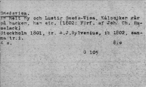 //// Srtedsvisa. , //// yr helt ^y och Lustir 3m ed s-Wisa, Kalpojker gar På barken, ha^ etc. (1802: Förf. af Joh. Ch. P.u-selack) //// Stockholm 1801, tr. A .J .Sylvenius, ib 1802 , samma tr:i. q //// A 010 //// 4 a. //// G 105 ////
