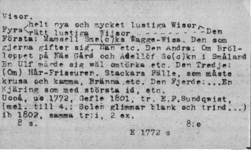 //// Vi?or. //// /helt nya och mycket lustiga Wisor //// *yra^rätt lust i ra pjsor --- -Den //// Första: Mamsell Smeycjks Wagge-Wisa. Den som gjerna gifter sij?, Han"etc. Den Andra: Om Bröl-loppet på Fäs Gård och Aiellcf 3o(c}kn i Småland En Ulf må "de sig wäl om t för ka etc. Den Tredje: (Om) Hår-Friseurer. Stackars Palle, som måste krusa och kamma. Bränna.etc. Den Fjerde:,,.En Kjäring som med största id, etc. Uooå, u« 1772, Gefle l601, tr. E.P.Sundqwist, (mel. till 4.; Solen glimmar tlank och trind.,.) ih 1802, samma tr:i, 2 ex. //// 8 s. 8:0 //// E 1772 c ////