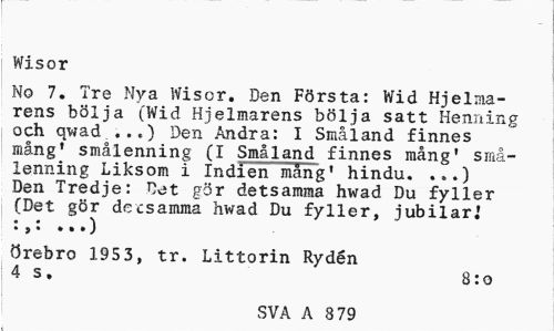//// Wisor //// No 7. Tre Nya Wisor. Den Första: Wid Hjelma-rens bölja (Wid Hjelmarens bölja satt Henning och qwad ..,) Den Andra: I Småland finnes mång' smålenning (I Småland finnes mång' små-lenning Liksom i Indien mång' hindu. ...) Den Tredje: Det gör detsamma hwad Du fyller (Det gör decsamma hwad Du fyller, jubilar.' //// • 5 » • • • ) //// Örebro 1953, tr. Littorin Rydén 4 s. 8:o //// SVA A 89 31 ////