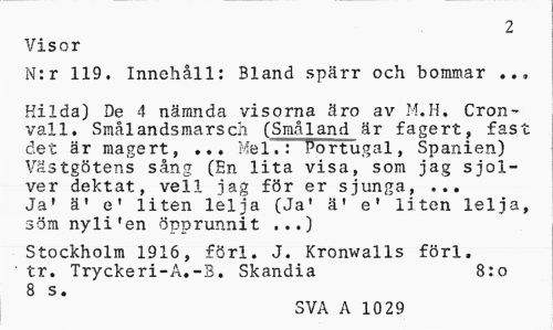 //// 2 //// Visor //// N:r 119. Innehåll: Bland spärr och bommar . //// Hilda) De 4 nämnda visorna äro av M.H. Cron-vall. Smålandsmarsch (Småland är fagert? fast det är magert, ... Mel.: Portugal, Spanien) Västgötens sång (En lita visa, som jag sjol-ver dektat, veil jag för er sjunga, ... Ja' ä' e* liten lelja (Ja' ä' e' liten lelja, söm nyli'en öpprunnit ...) //// Stockholm 1916, förl. J. Kronwalls förl. • tr. Tryckeri-A.-B. Skandia 8:o //// 8 s //// SVA A 10 29 ////