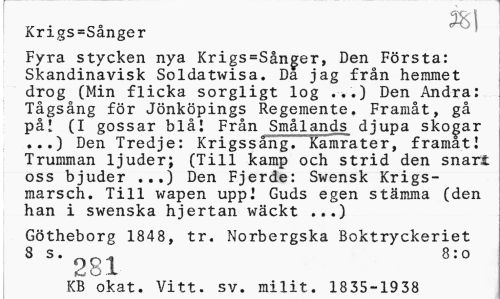 //// % //// Krigs=Sånger //// Fyra stycken nya Krigs=Sånger, Den Första: Skandinavisk Soldatwisa. Da jag från hemmet drog (Min flicka sorgligt log ...) Den Andra: Tågsång för Jönköpings Regemente. Framåt, gå på! (I gossar blå! Från Smålands. djupa skogar ? ..) Den Tredje: Krigssång." Kamrater, framat! Trumman ljuder; (Till kamp och strid den snart oss bjuder ...) Den Fjerde: Swensk Krigsmarsch. Till wapen upp! Guds egen stämma (den han i swenska hjertan wäckt ...) //// Götheborg 1848, tr. Norbergska Boktryckeriet 8 s. 8:0 //// Iw kJ //// KB okat. Vitt. sv. milit. 1835-1938 ////