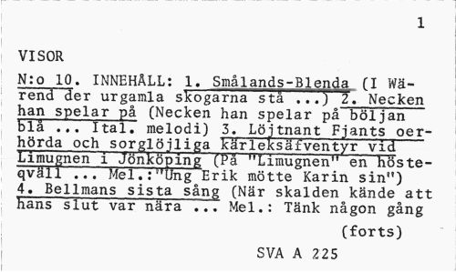 //// 1 //// VISOR //// N:o 10. INNEHÅLL: 1. Smålands-Blenda (I Wä-rend der urgamla skogarna stå ...) 2. Necken han spelar på (Necken han spelar på böljan blå ... I tal. melodi) 3. Löjtnant Fjants oerhörda och sorglöjliga kärleksäventyr vid Limugnen i Jönköping (På "Limugnen" en höste-qväll ... Mel.:"Ung Erik mötte Karin sin") 4. Bellmans sista sång (När skalden kände att hans slut var nära ... Mel.: Tänk någon gång //// (forts) //// SVA A 225 ////