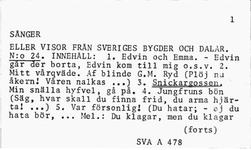 //// 1 //// SÅNGER //// ELLER VISOR FRÅN SVERIGES BYGDER OCH DALAR. N:o 24. INNEHÅLL: 1. Edvin och Emma. - Edvin gär der borta, Edvin kom till mig o.s.v. 2. Mitt vårqväde. Af blinde G.M. Ryd (Plöj na åkern! Våren nalkas 3. Snickargossen. //// Min snälla hyfvel, gå på. 4. Jungfruns bön (Säg, hvar skall du finna frid, du arma hjärta! ...) S. Var försonligi (Du hatar; - ej du hata bör, ... Mel.: Du klagar, men du klagar //// (forts) //// SVA A 478 ////