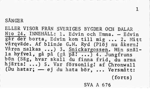 //// 676 //// SÅNGER //// ELLER VISOR FRÄN SVERIGES BYGDER OCH DALAR N:o 24. INNEHÅLL: 1. Edvin och Emma. - Edvin går der borta, Edvin kom till mig ... 2. Mitt vårqväde. Af blinde G.M. Ryd (Plöj nu åkern.' Våren nalkas ...) 3. Snickargossen. Min snälla hyfvel, gå på (gå på! . . J 4. Jungfruns bön (Säg, hvar skall du finna frid, du arma hjärta! ...) 5. Var försonlig! af Chronwall (Du hatar; —ej du hata bör, ... Versmått: //// (forts) //// SVA A 270 ////