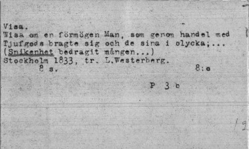 //// Viaa, //// TS'ia& om en förmögen Man, som genom handel med Tjufftods bragte sig ooh de sina i olycka;... //// bedragit -sången...) Stockholm 1833, tr. L.Westerberg. //// 8 s, 8: o //// # ////
