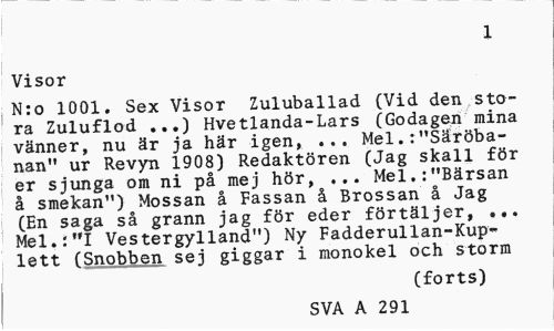 //// 291 //// Visor //// . N:o 1001. Sex Visor Zuluballad (Vid den stora Zuluflod ...) Hvetlanda-Lars (Godagen mina vänner, nu är ja här igen, ... Mel.:"Säröba-nan" ur Revyn 1908) Redaktören (Jag skall för er sjunga om ni på mej hör, ... Mel.:"Bärsan å smekan") Mossan å Fassan å Brossan å Jag (En saga så grann jag för eder förtäljer, ... Mel.:"I Vestergylland") Ny Fadderullan-Kuplett (Snobben sej giggar i monokel och storm //// (forts) //// SVA A 478 ////