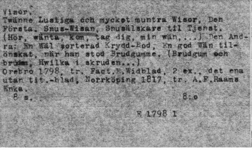 //// Visor, //// Twanne Lustiga öcii myc k* t muntra Wisor, Den Första* Snu««Wiiant: Snuwälskare til : //// (Hör, wSWTWTW wän,...) ,nen And- //// ra: Sn Wäl porterad Krydd-£od, Yn *?od Wän til-önskat, när han stod Srudgumme. (Brudgum ®ch b närt», Hwilka i skruden...} //// Örebro 1798, tr. Fäet .E.Widblad, 2 ex,, det ena utan tit.-blad, Kotrköping l8l7, tr. A.F.Raams Enka. . //// 8 s. ; 8:o //// . * 1798 1 //// % > 1V * ** / ... ^ 1 « ¦ -.. v'i-.:' v.. ^ .. , ,- «• . .. //// « - ' ¦¦!-:•„--¦ V - i . \Y '¦•• . J • :, ... //// " .' - : ,'-- -s:. .. :.. 'V ... ¦ ////