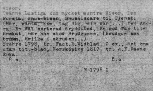 //// Ytaor , ^ //// Twiims Lustiga, ocfe rtycicot muntra Wisor, Den ^ Forft». t>nus»*xsan, änusälsicAre til X-jenst. (Hor, wäntÄ/"kom tag difj, »nf n irär»,1'. Den Andra: Sn Wäl sorterad Krydd-£©d, Rri god Wän til» önskat, när han stod Brudgumme. (Brudgum brd$m, Hwilka i skruden..,) //// Örebro tr. Fact .Widblad, ? ex., det ena //// utan tit.-blad, Norrköping l8l7, tr, A.F.Raams Erika. . //// P s. 8:0 //// , ,, * : B 1798 1 ////