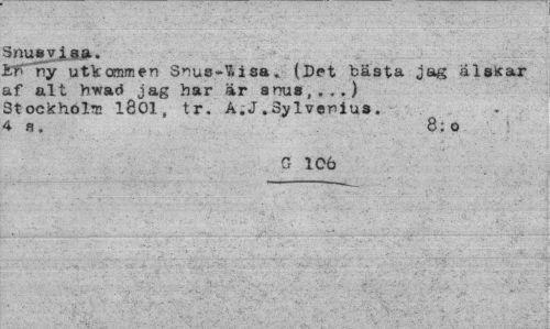 //// Snusvi sa. //// fcn ny utkommen Snus-7»isa. (Det bästa jag alssar af alt hwad jag har är snus,...) Stockholm 1801, tr. A.J.SyIvenius. 4 s. 8:0 //// G 106 ////