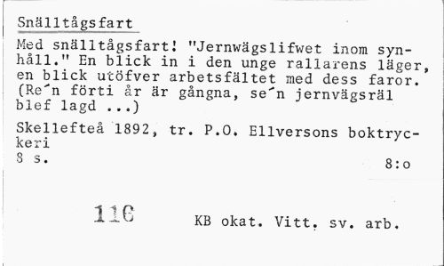 //// Snälltågs fart //// Med snälltågsfartI "Jernwägslifwet inom synhåll." En blick in i den unge rallarens läger, en blick utöfver arbetsfältet med dess faror. (Re'n förti år är gångna, se^n jernvägsräl blef lagd ...) //// Skellefteå 1892, tr. P.O. Ellversons boktryckeri //// 8 s. 8:0 //// i I //// HB KB okat. Vitt. sv. arb. ////
