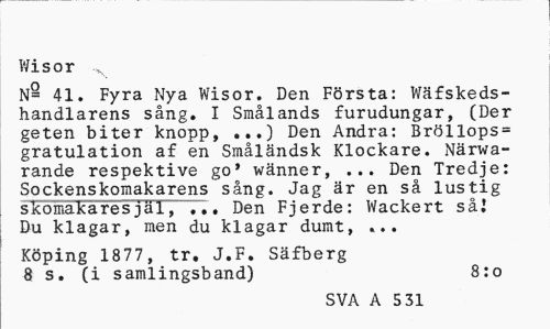 //// Wisor x //// N= 41. Fyra Nya Wisor. Den Första: Wäfskeds-handlarens sång. I Smålands furudungar, (Der geten biter knopp, ...) Den Andra: Bröllops= gratulation af en Småländsk Klockare. Närwa-rande respektive go* wänner, ... Den Tredje: Sockenskomakarens sång. Jag är en så lustig skomakaresjäl, 77, Den Fjerde: Wackert så! Du klagar, men du klagar dumt, ... //// Köping 1877, tr. J.F. Säfberg 8 s. (i samlingsband) 8:o //// SVA A 5 31 ////