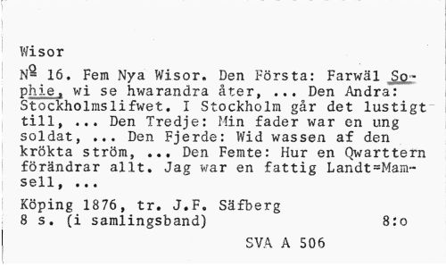 //// Wisor //// 16, Fem Nya Wisor. Den Första: Farwäl Sp~ phie , wi se hwarandra åter, ... Den Andra: Stockholmslifwet. I Stockholm går det lustigt till, ... Den Tredje: Min fader war en ung soldat, ... Den Fjerde: Wid wassen af den krökta ström, ... Den Femte: Hur en Qwarttern förändrar allt. Jag war en fattig Landt=Mam-sell, ... //// Köping 1876, tr. J.F. Säfberg 8 s. (i samlingsband) 8:o //// SVA A 506 ////