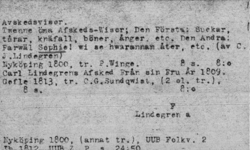//// Avsk edsviser. //// Iwenni? Af sked s~Si'i sor; Den Företa; Suekar, tårar, knäfall, bgner, ånger. etc. Den Andra: Farwäl Sophiel wi se hwarannars åter, etc, (av C. i .l.j nd<»gren} //// Nyköping iSoo, tr. P.Winse. R s. 8; o //// Carl Lindegrens Af sked Från sin Fru År 1809. Gefle 1813, tr. O.G.Sundqwist, (2 ol. tr.), 8 s. //// . • : -v:: : ~ t ' \ • : //// Lindegren a //// Eyköplrig 1000, (annat tr.), UUB Folkv. 2 //// n O -i A ^ - . ////