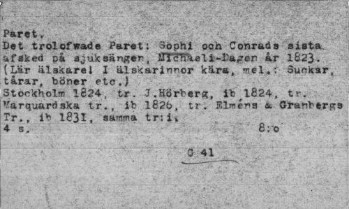 //// Paret. //// Det trolofwade Paret: 3ophl och Conrads sista af sked på sjuksängen, Ulcihael i-Dagen ar 1823. (Lär iilskarel I älskarinnor kära, mel,: Suckar, tårar, böner etc.) //// Stockholm 1624, tr. J.Hörberg, it 1824, tr. Varquardska tr., ib 1826, tr. Elméns & Granbergs Tr,, ib 1831, samma tr:i» 4 s. 8ro //// ' G 41 ////