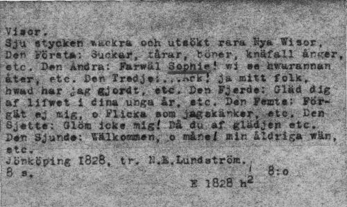 //// tiv* * It ^^ „ //// Visor. //// 3ju stycket *Eckra wSsfc utttffc*. f&Ä . ti «©rv -t D«n i'örsta: Suckar, tårar, böner, knäfall ånger, etc . Den Andra: fft&Uft? aa-fettarannan. ! //// åter, etc. Den Iredja: .TTatT! mitt folk, • hwad har jag g^ordt,; Da» Gläd dig //// af lifwet i dina unga år, etc. Den ?eata; Förgät mig, © i'licjca aots jÄgckankar, etc. Den Sjätte: Slö» icke mig/ Då du af glädjen etc. //// Dan Sjur.da: ffiUk ©«»•»», .0 måne i min åldriga »än, //// * m ^ ¦•-;: -v-.,- - //// Jönköping 1828, t>* &«£«iu»*«tr$ft. . 8 a. ^ " ' 8:0 //// * 1828 h2 ////