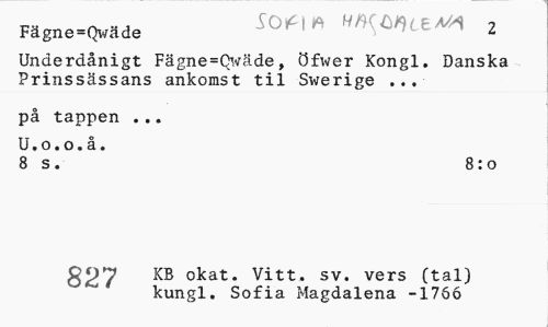 //// Fägne=Qw*Hde " »^LtA* 2 //// Underdånigt Fägne=Qwäde, öfwer Kongl. Danska Prinssässans ankomst til Swerige ... //// på tappen ... U.o.o.å. //// 8 s. 8:0 //// §27 KB okat- Vitt, sv. vers (tal) kungl. Sofia Magdalena -1766 ////