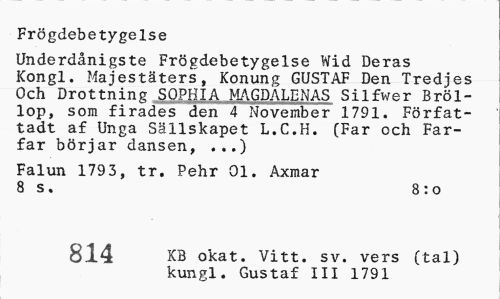 //// Frögdebetygelse //// Underdånigste Frögdebetygelse Wid Deras Kongl. Majestäters, Konung GUSTAF Den Tredjes Och Drottning SOPHIA MAGDALENAS Silfwer Bröllop, som firades den 4 November 1791. Förfat-tadt af Unga Sällskapet L.C.H. (Far och Farfar börjar dansen, ...) //// Falun 1793, tr. Pehr 01. Axmar 8 s. 8:o //// 814 KB okat. Vitt. sv. vers (tal) kungl. Gustaf III 1791 ////