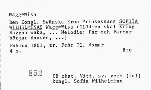 //// Wagg=Wisa //// Den Kongl. Swänska Kron Prinsessans SOPHIA WILHELMINAS Wagg=Wisa (Glädjen skal kring Waggan waka, ... Melodie: Far och Farfar börjar dansen, ...) //// Fahlun 1801, tr. Pehr 01. Axmar 4 s. 8:o //// KB okat. Vitt. sv. vers (tal) kungl. Sofia Wilhelmina ////