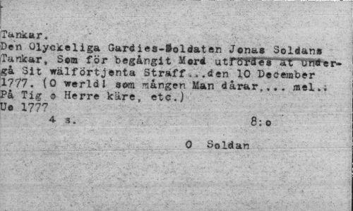//// Pankar. //// Den Olyckeliga Garöies-Soldaten Jonas Soldans lankar, Sem för begångit Mer* u t f ftfXeå 'a't"tm<her-ga Sit wälförtjenta Straff...den 10 December 1777. (O werldl som mången Man dårar... mel»; På Tiat o Herre käre, etc.) Do 1777 //// 4 3. 8; o //// O Soldan ////