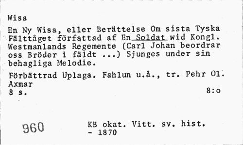 //// Wisa //// En Ny Wisa, eller Berättelse Om sista Tyska Fälttåget författad af En .Soldat, wid Xongl. Westmanlands Regemente (Carl Johan beordrar oss Bröder i fäldt ...) Sjunges under sin behagliga Melodie. //// Förbättrad Uplaga. Fahlun u.å., tr. Pehr 01. Axmar //// 8 s. 8:0 //// tj^Q KB okat. Vitt. sv. hist. ////