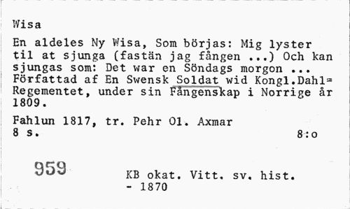 //// Wisa //// En aldeles Ny Wisa, Som börjas: Mig lyster til at sjunga (fastän jag fången ...) Och kan sjungas som: Det war en Söndags morgon ... Författad af En Swensk Soldat wid Kongl.Dahl= Regementet, under sin fångenskap i Norrige år 1809. //// Fahlun 1817, tr. Pehr 01. Axmar 8 s. 8: o //// 959 KB okat. Vitt, sv. hist. //// - 1870 ////