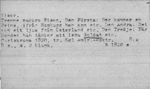 //// Vi ser. //// Trenne wackra Wisor., De^ Första: Der kommer en ?rin.s, ifrå" Hamtur/? han kom etc. Den Andra. Det k c*! *tt ljus från Csterland etc. De^ Tredje; När Bonden han tänker att le öra oeldat etc. " riskrona 1820, tr. K«r1 Am?r,-coktr. 8:c //// p. s., 3. 2 fcla«k. K. 18::O • ////